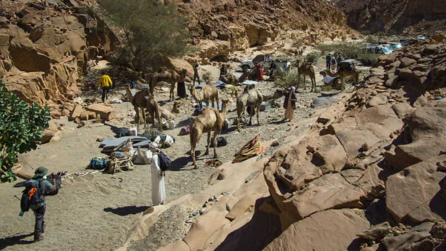 In order to reach the summit we would have to first deal with both the bureaucratic and logistical problems involved in crossing a desert mountain range. Luckily our in-country team SVS had liaised with our local guide and arranged for us to meet the Toubou at their village at the base of the volcano. From there we would be able to negotiate for, and rent, twelve camels and their handlers who would be responsible for getting our remaining expedition gear up to the last camp in the caldera of the volcano and back down again. A journey that would take nine days.